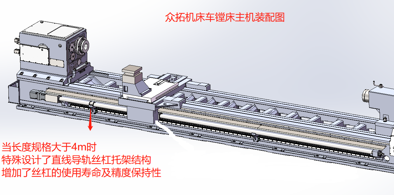 為設備的內(nèi)孔鏜削加工提供足夠的剛性支撐。拖板絲杠中置,絲桿軸承支座裝配時充分找正,并采用預拉伸結(jié)構,提高了剛性及穩(wěn)定性。