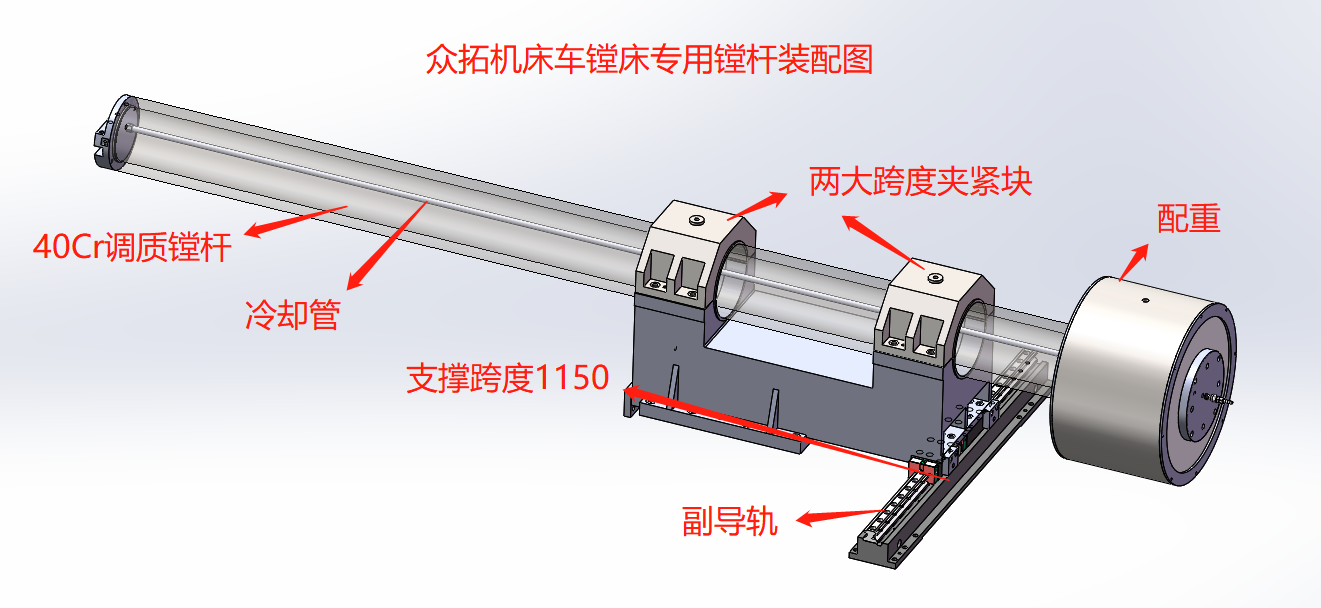 由后節(jié)床體,鏜桿進給拖板及固定架,鏜桿支撐拖板及支架,鏜頭導向部分,鏜頭,冷卻組成。